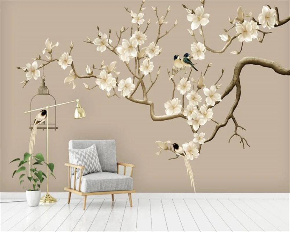 beibehang 3d wallpaper hand painted flower bird illustration magnolia flower hand painted tv backdrop wallpaper for walls 3 d