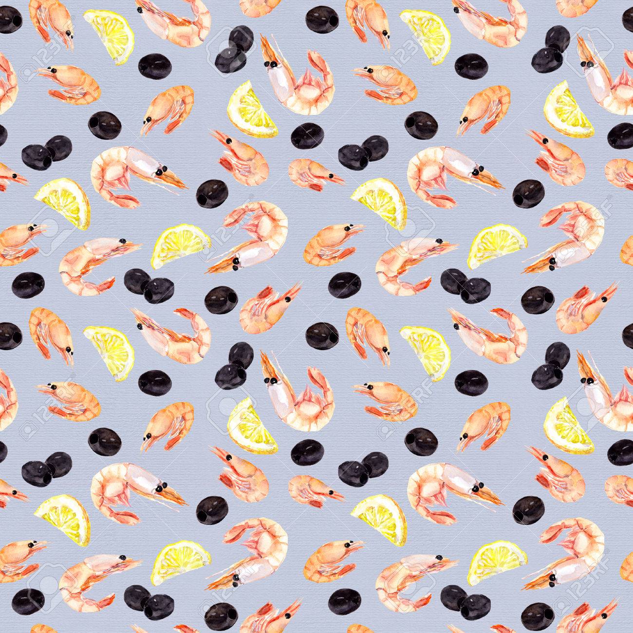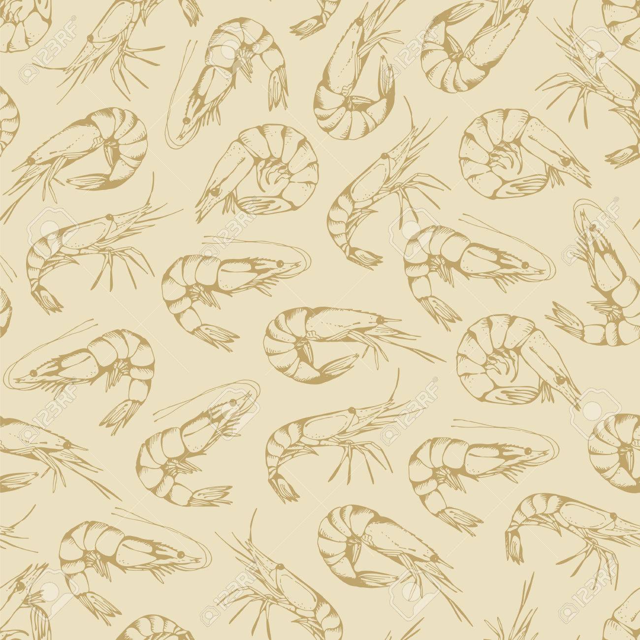 seamless pattern with hand drawn shrimps on a beige background