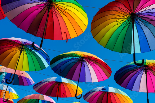 many colorful umbrellas city street