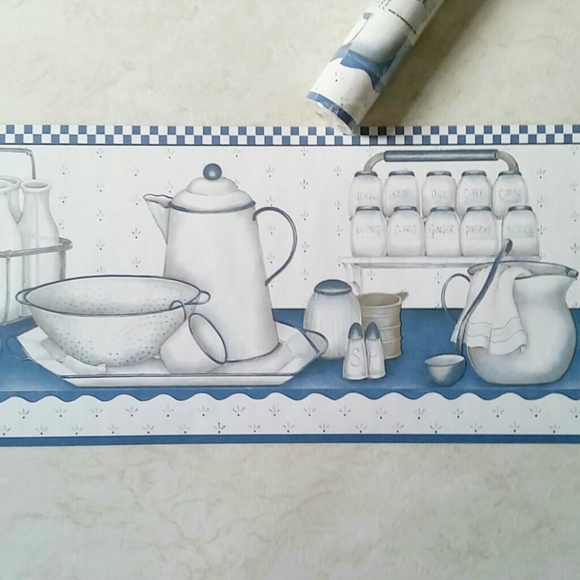 wallpaper border blue white county kitchen