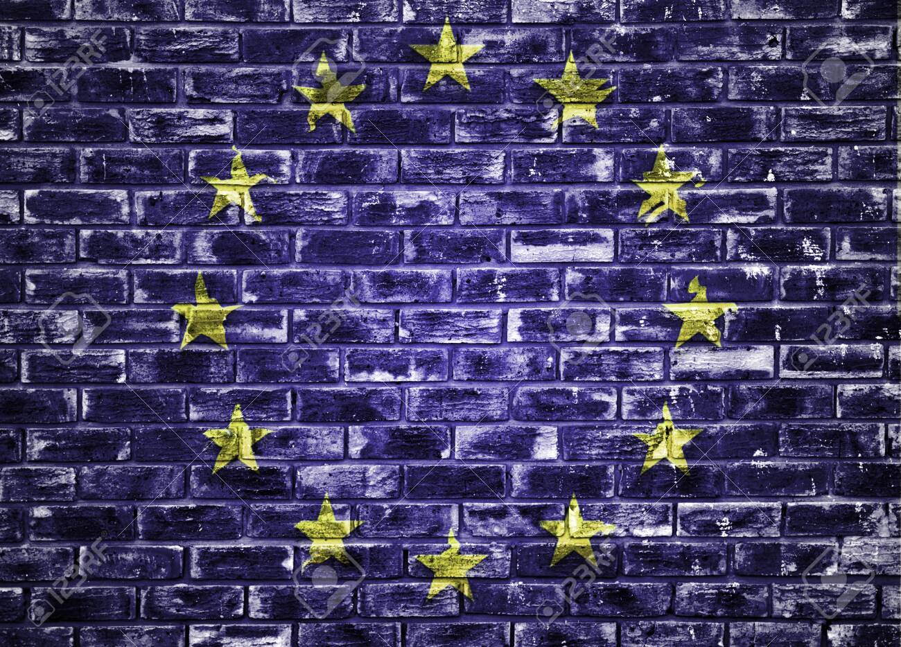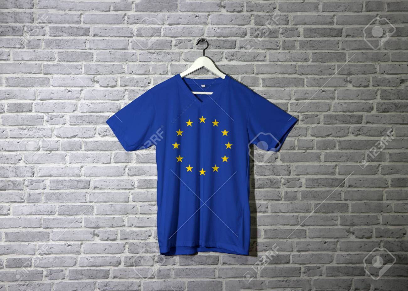 european union flag on shirt and hanging on the wall with brick