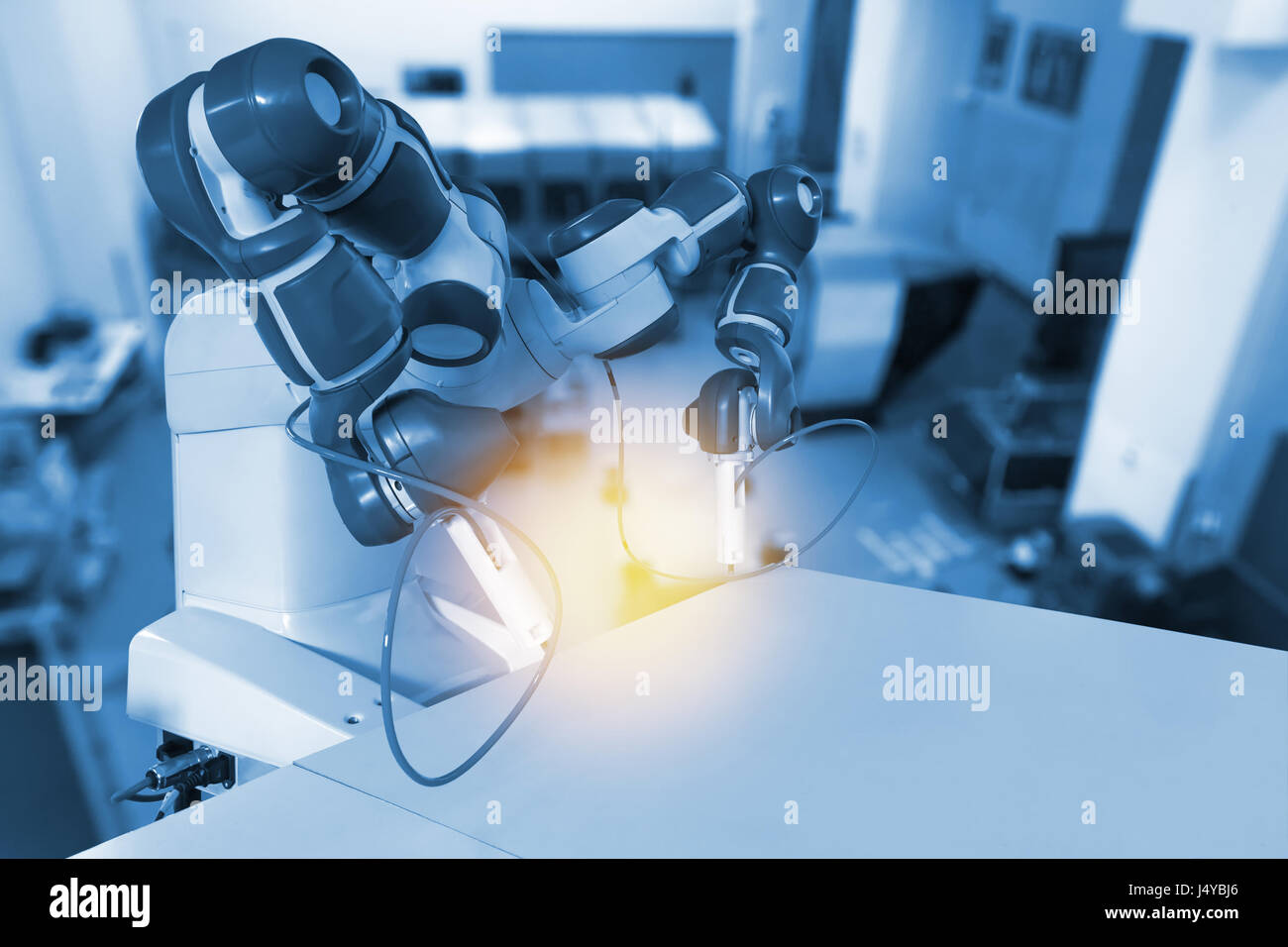 https www alamy com industrial robotic welding and robot gripping working on smart factory on machine blue tone color background industry 40 and technology image260858458 html