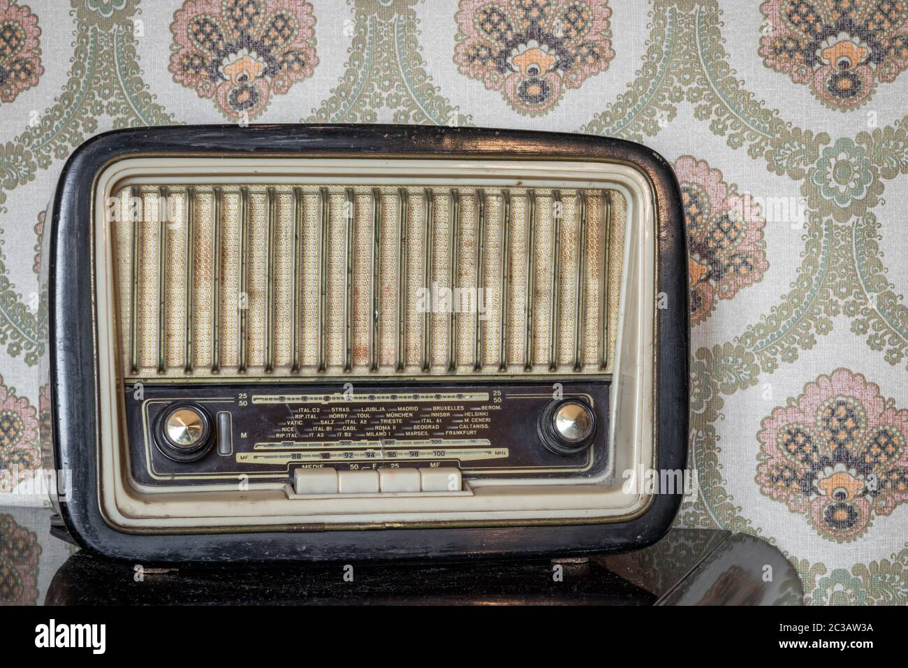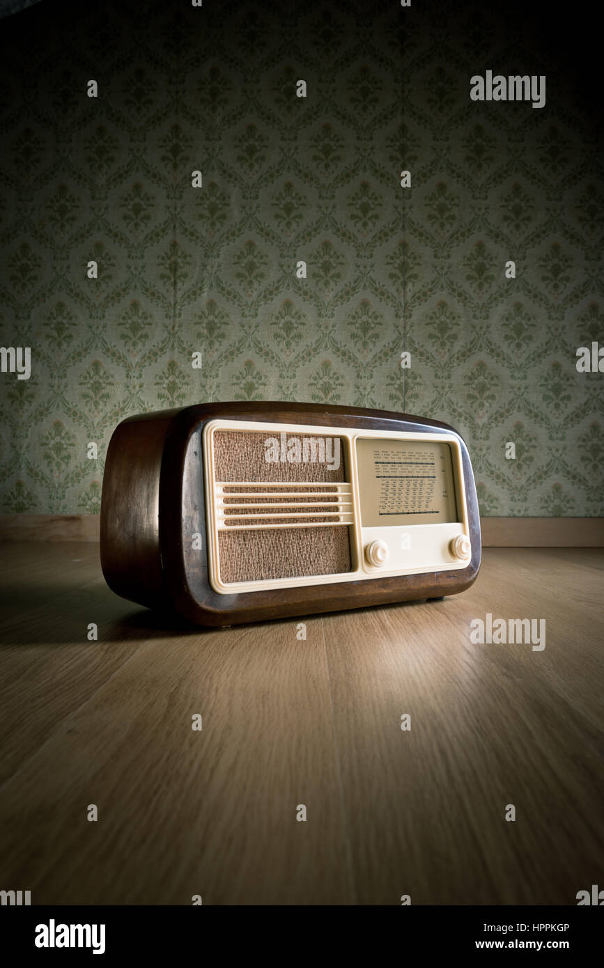 https www alamy com stock photo old vintage radio on hardwood floor with retro wallpaper on background 134493318 html